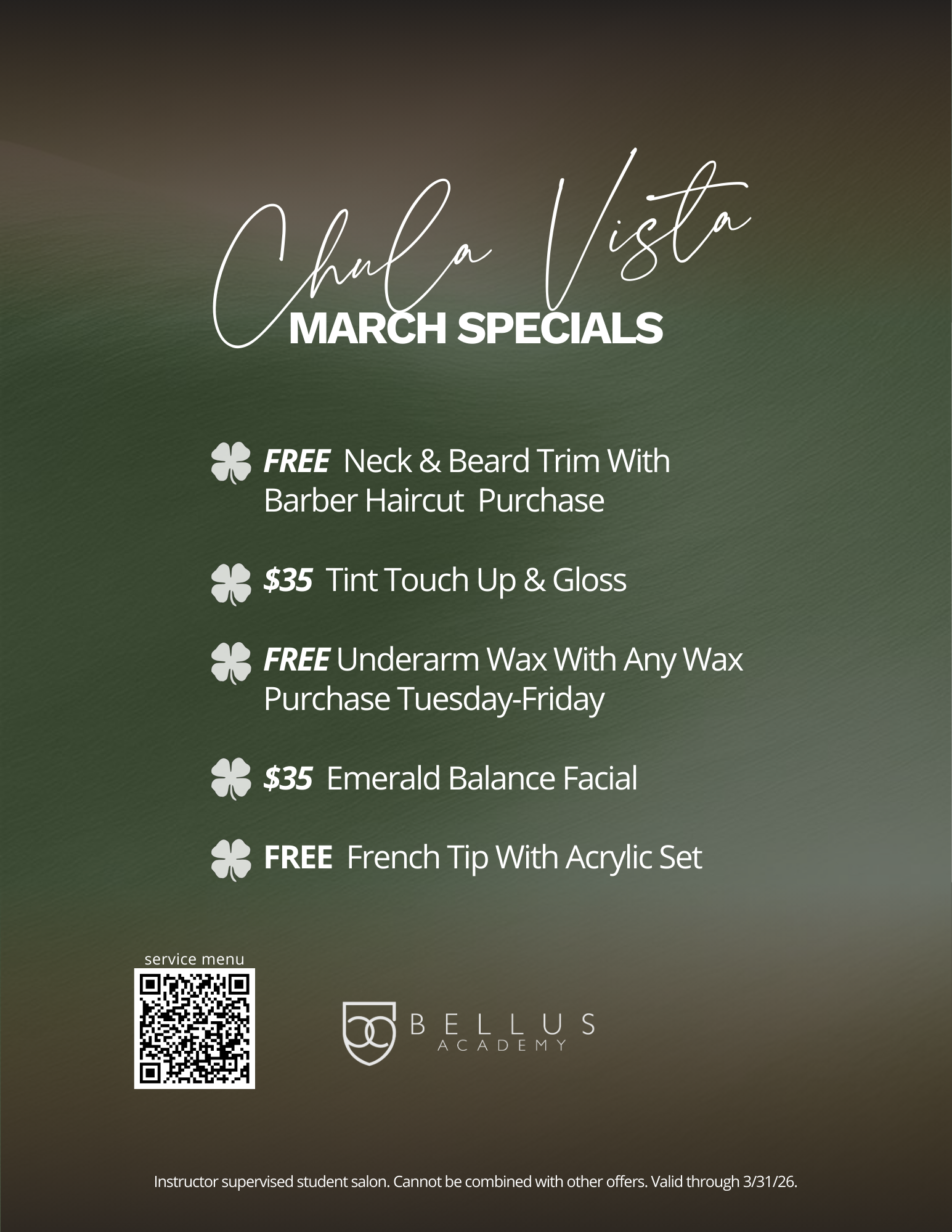 All work is performed by supervised students. Prices and availability of services are subject to change without notice. Requests for certain students are accepted but not guaranteed. Federal Law prevents us from disclosing information on individual students. Other information about our academy and policies can be found at bellusacademy.edu.