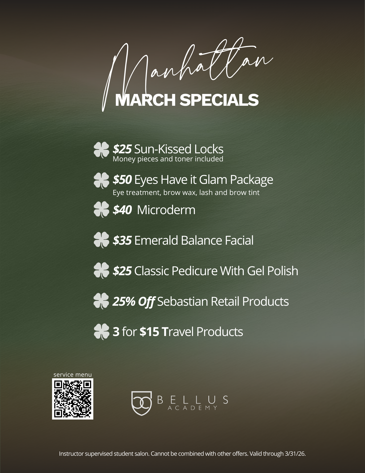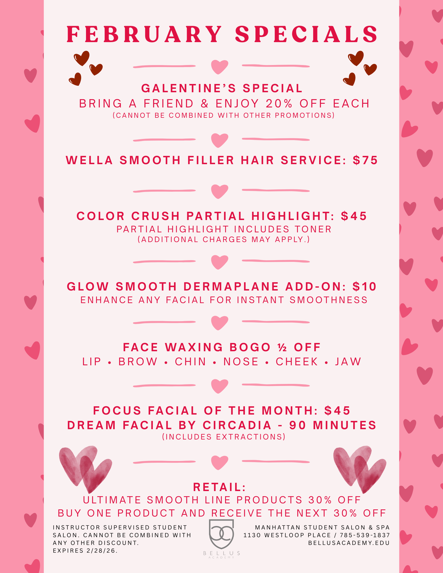 All work is performed by supervised students. Prices and availability of services are subject to change without notice. Requests for certain students are accepted but not guaranteed. Federal Law prevents us from disclosing information on individual students. Other information about our academy and policies can be found at bellusacademy.edu.