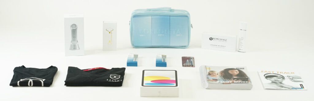 Bellus Academy offers four different Esthetics kits to students, depending on which program they choose. Each program comes with technology tools like an iPad, uniforms, including scrub tops and pants, and personalized business cards. The other kit items are program-specific and include::